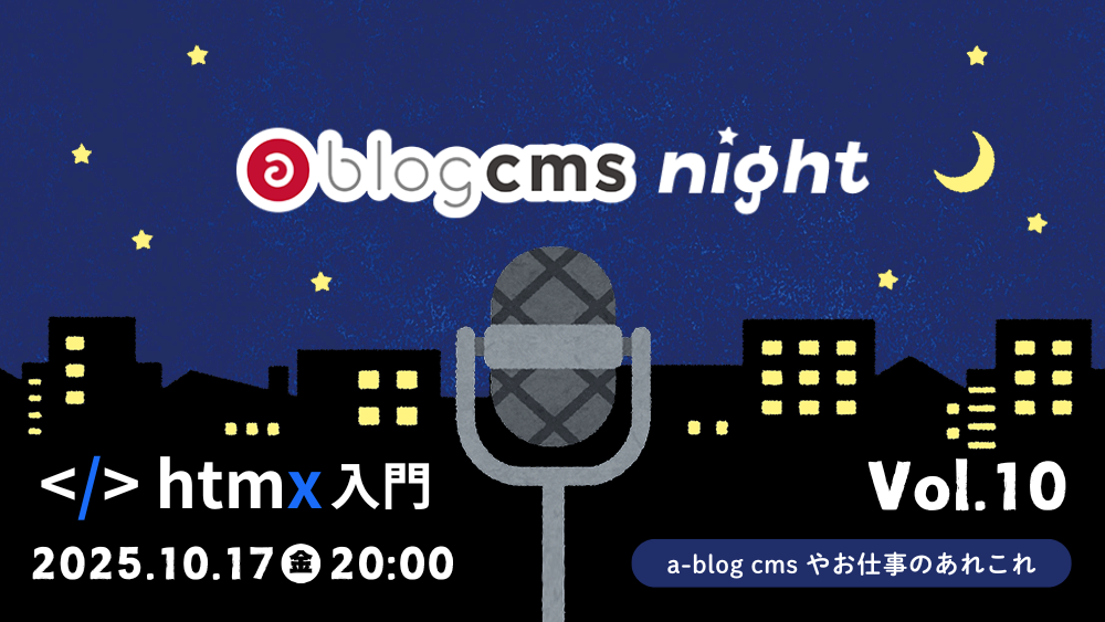 普段は a-blog cms のユーザーさんをゲストにお迎えしてお話を伺う配信を行っていますが、今回は少し趣向を変えてみます。10/3.4 に配信の際に #朝までマークアップ 3(JS編)で時間の都合で十分に紹介できなかった「htmx のバックエンドに a-blog cms を使うと何がいいのか」というテーマを、しっかり掘り下げて解説する配信を予定しています。